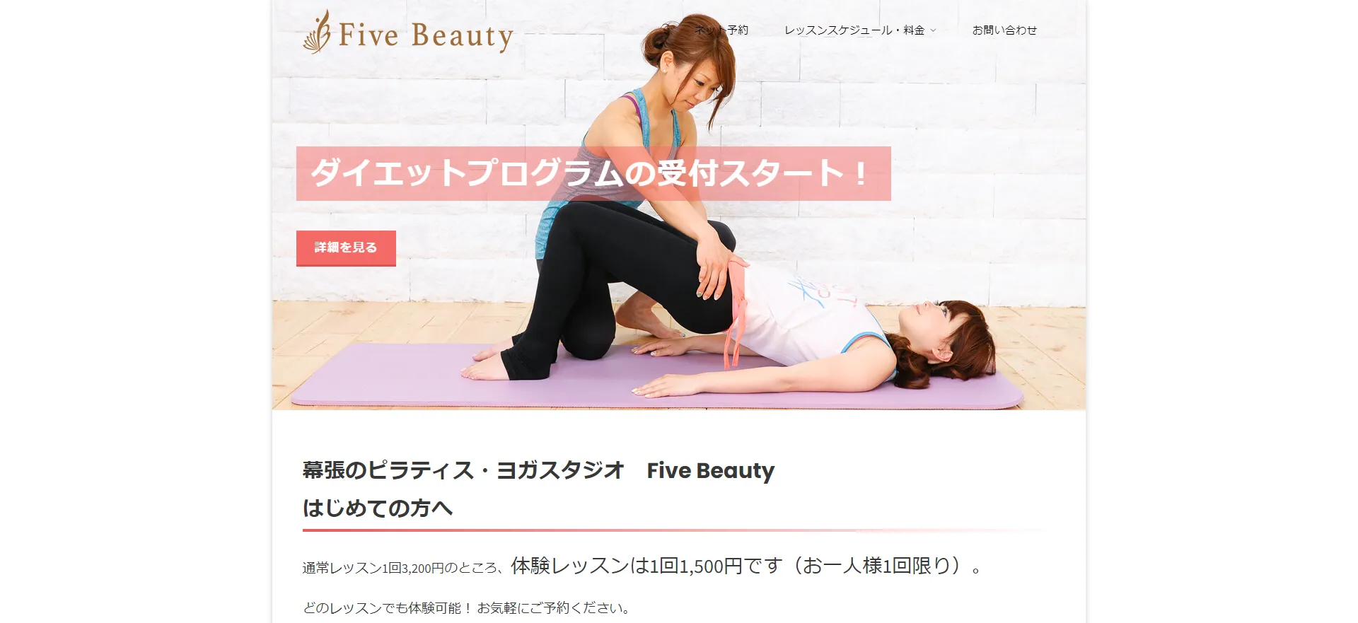 | Five Beauty(ファイブビューティー) | 公式サイト | 月額9,200円〜 | 1,500円 | マットピラティス | グループ |