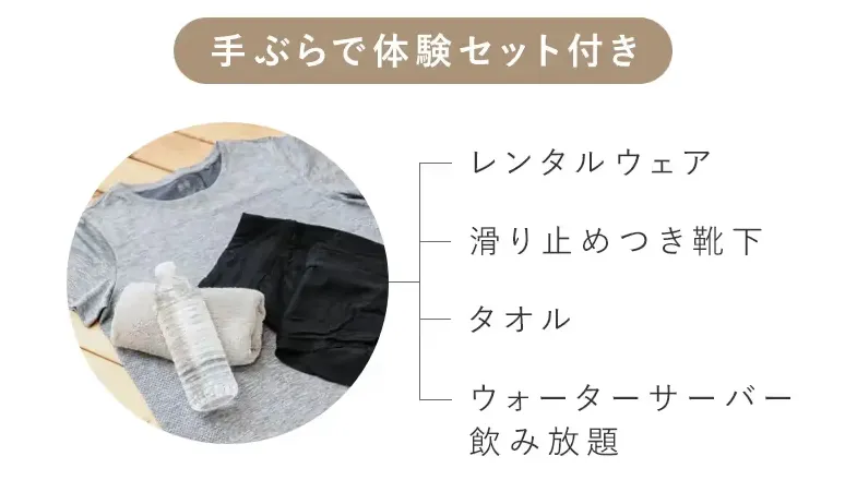 ウェア・タオルなどのレンタルが付いた「手ぶらで体験セット」付きなので、仕事帰りや買い物のついでにも気軽に立ち寄れるのも魅力ですね。