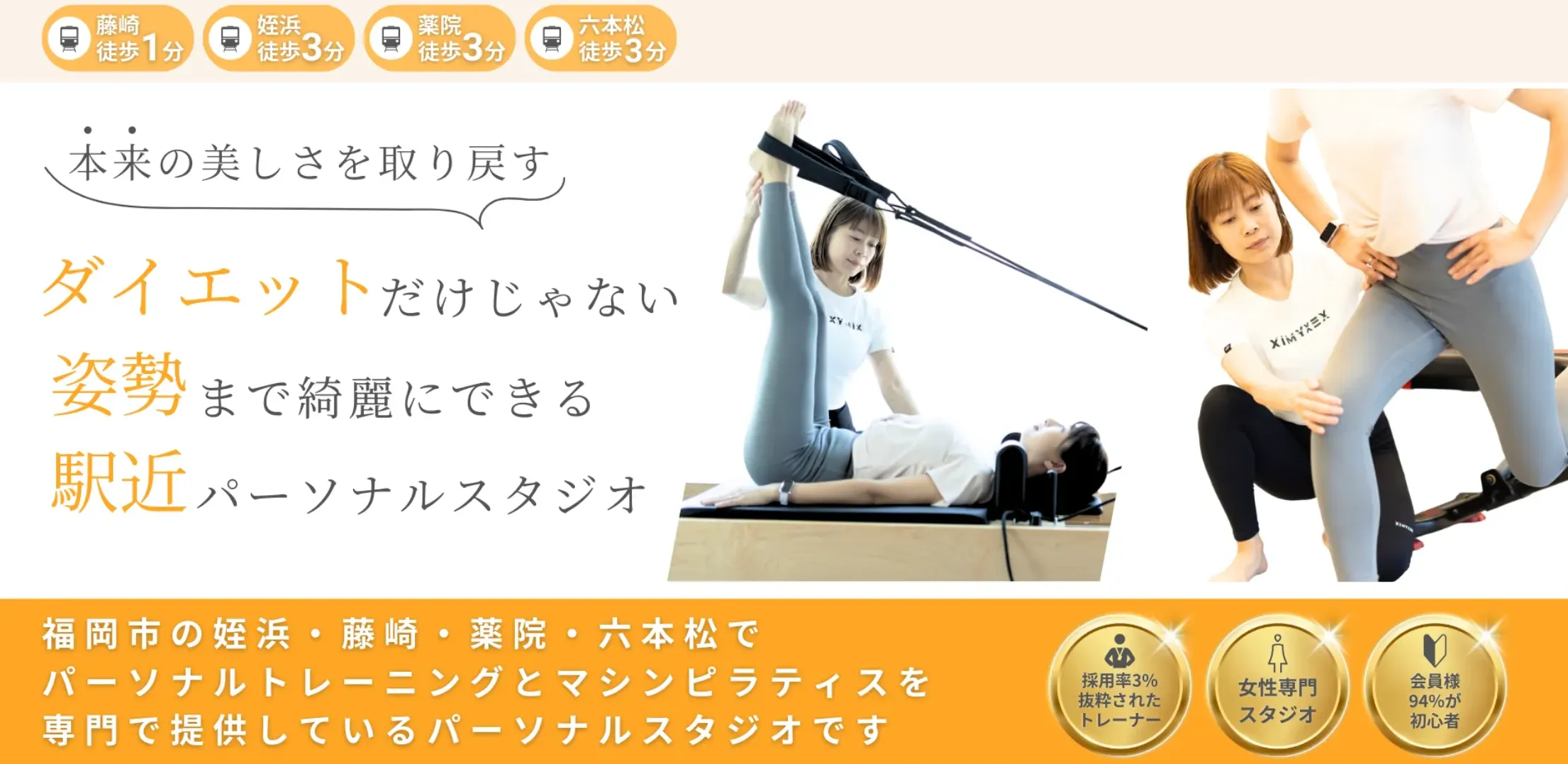 studio03 六本松店は、女性専用のパーソナルトレーニングジムで、マシンピラティスのマンツーマンレッスンを提供しています。地下鉄七隈線六本松駅から徒歩5分の便利な立地にあり、個々のニーズに合わせたトレーニングプログラムを提供しています。