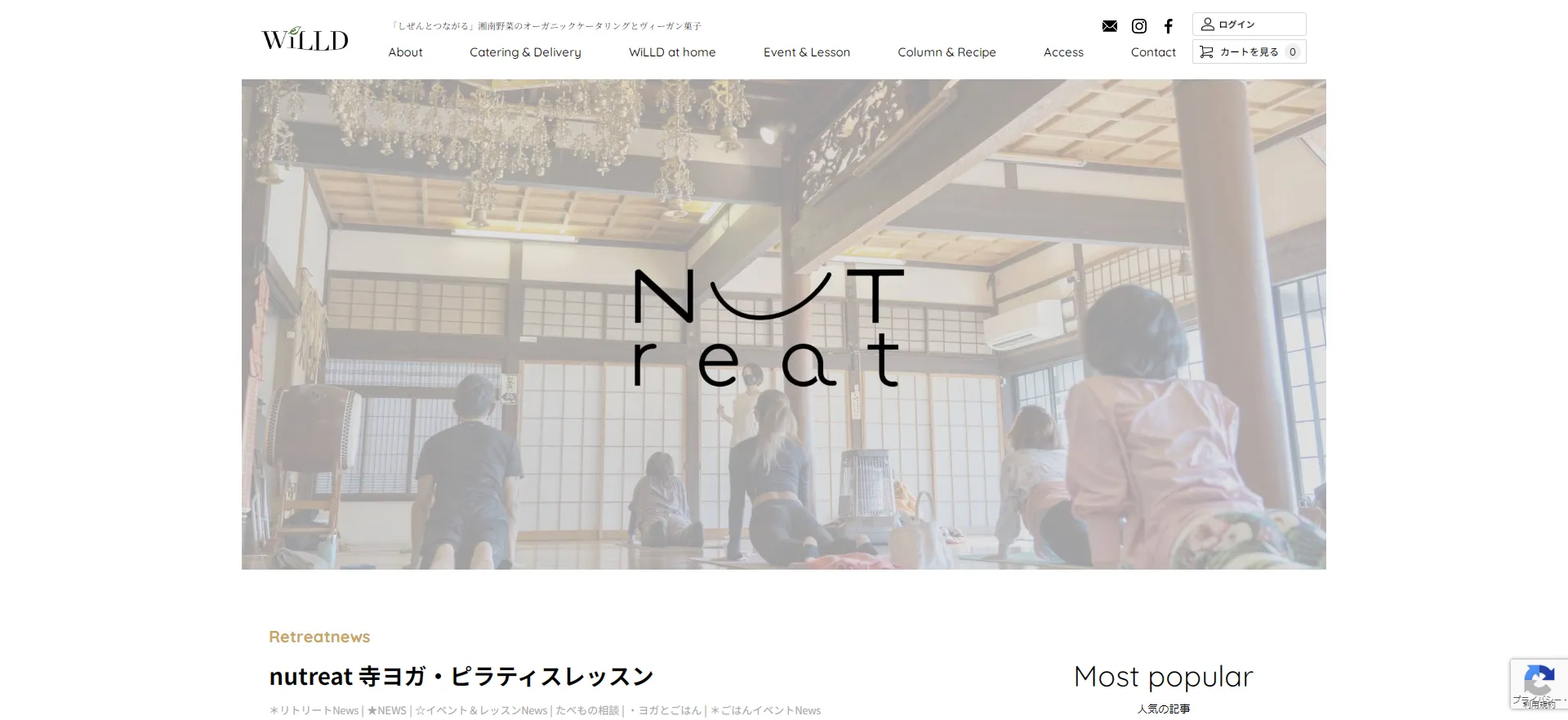 WiLLDが提供する「nutreat」は、神奈川県大磯町の歴史あるお寺「妙輪寺」の本堂を舞台に開催される、ユニークなヨガ・ピラティスレッスンです。栄養学(Nutrition)とリトリート(Retreat)を組み合わせた造語「nutreat」のとおり、管理栄養士が考案したヨガ哲学・栄養学・解剖学を融合した健康サービスが特徴。ピラティスストレッチ・やさしいヨガ・産後ヨガなど多彩なプログラムが用意されており、運動が苦手な方や初心者でも安心して参加できます。非日常的なお寺という空間で心身をリセットしたい方に最適です。