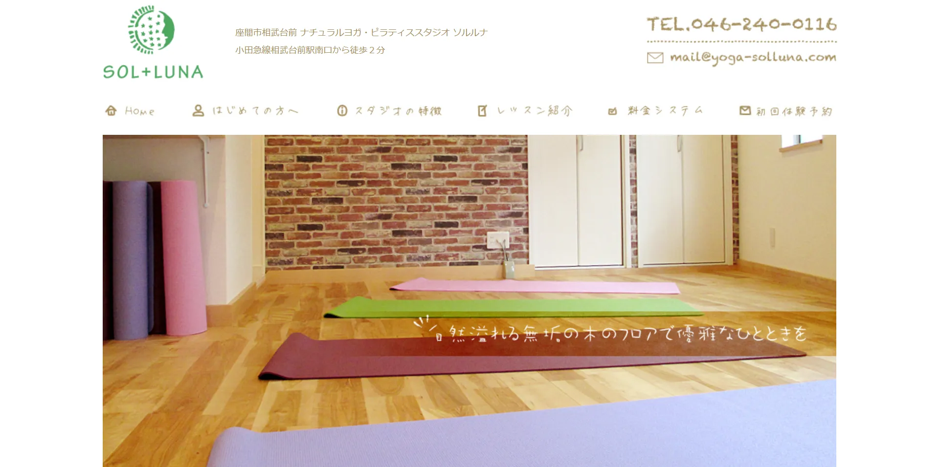 | ナチュラルヨガスタジオ ソルルナ | 公式サイト | 詳細は公式サイト参照 | 無料体験 | ヨガ・マットピラティス | グループ・パーソナル |