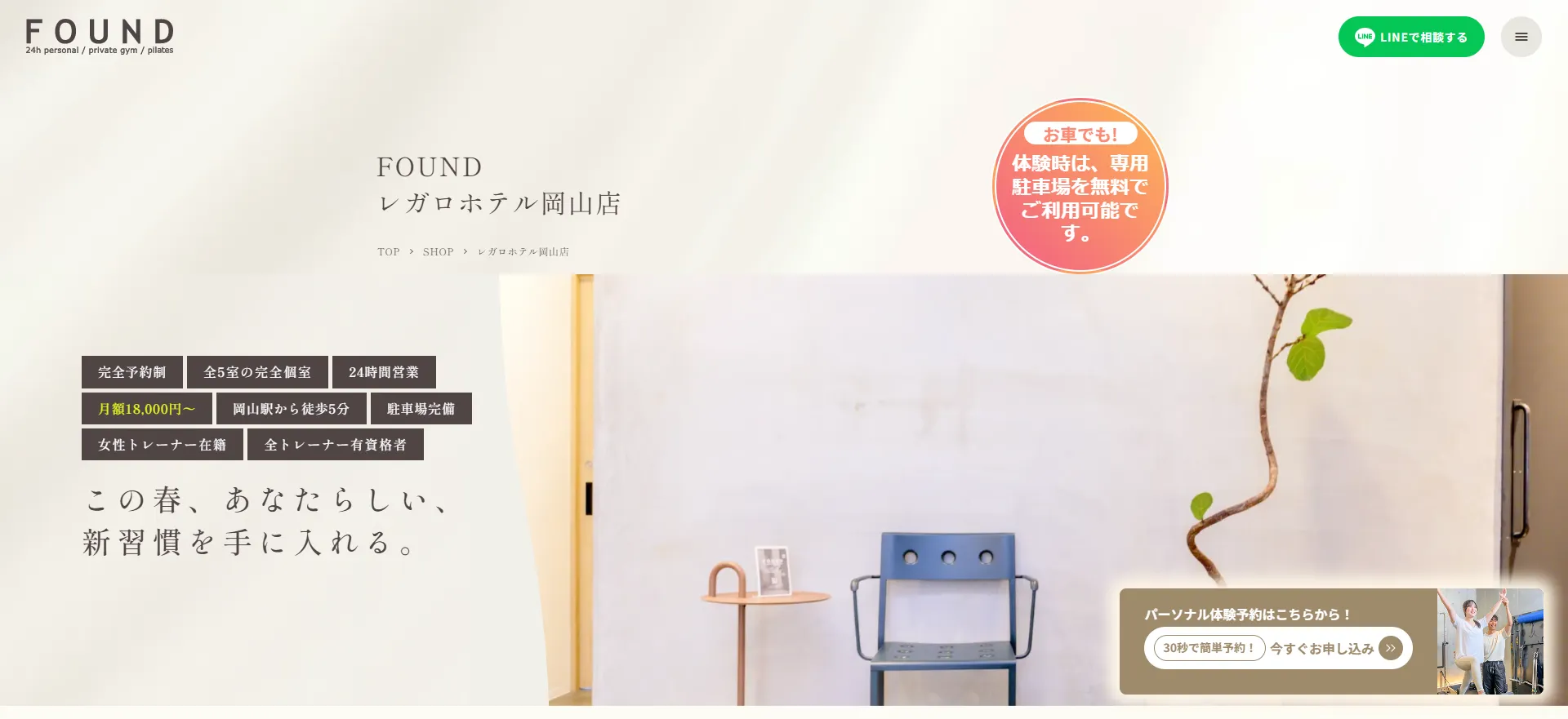 画像出典:https://found-gym.jp/shop/regalo(FOUND レガロホテル岡山店公式サイト)