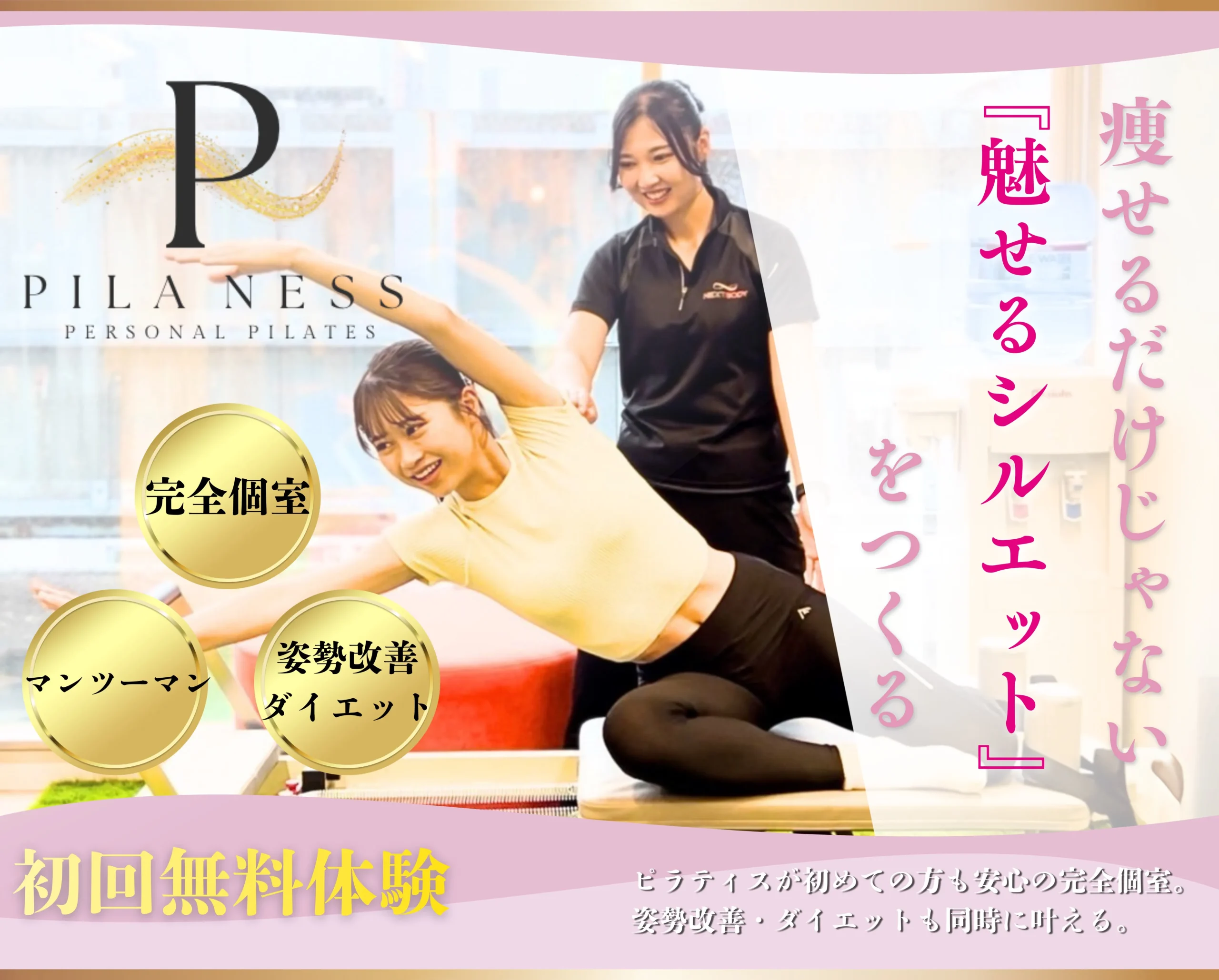 パーソナルマシンピラティスSAKURAは、完全個別レッスンで一人ひとりの体に合わせたサポートを行う女性専用のピラティススタジオです。