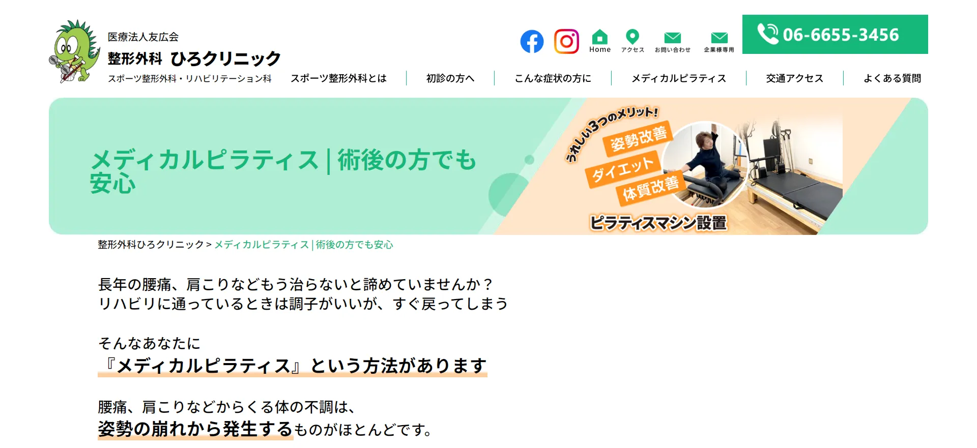 | 整形外科ひろクリニック | 公式サイト | 詳細は公式サイト参照 | – | マットピラティス | パーソナル |
