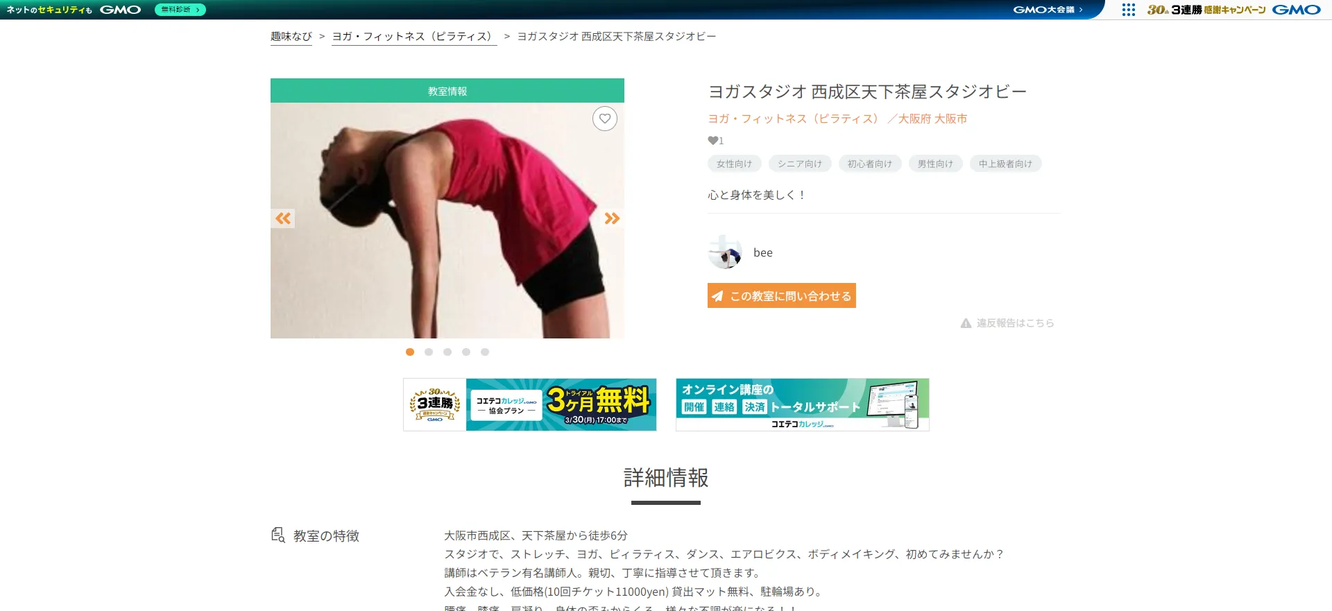| 天下茶屋スタジオBee | 公式サイト | 1回あたり1,500円〜 | 1,000円 | マットピラティス | グループ |