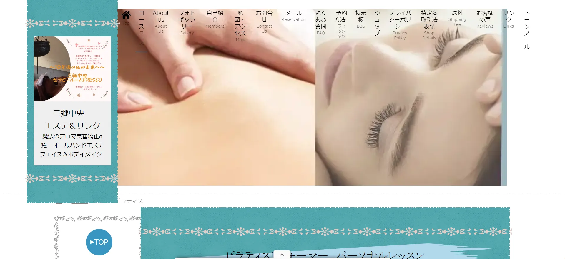 つくばエクスプレス「三郷中央」駅から徒歩14分の場所にある、セラピスト歴25年以上のプロが運営するオールハンドエステ&ボディメイクサロンです。異国情緒あふれる落ち着いた店内で、全身の疲れを癒しながらピラティスリフォーマーによるボディメイクが受けられます。エステ・整体・ピラティスを一か所で体験できるのがこのサロン最大の特徴。DNA遺伝子リスク検査に基づく食事カウンセリングも提供しており、内側からのダイエットサポートも充実。LINE登録で新規様向けのクーポンプレゼントも実施中です。