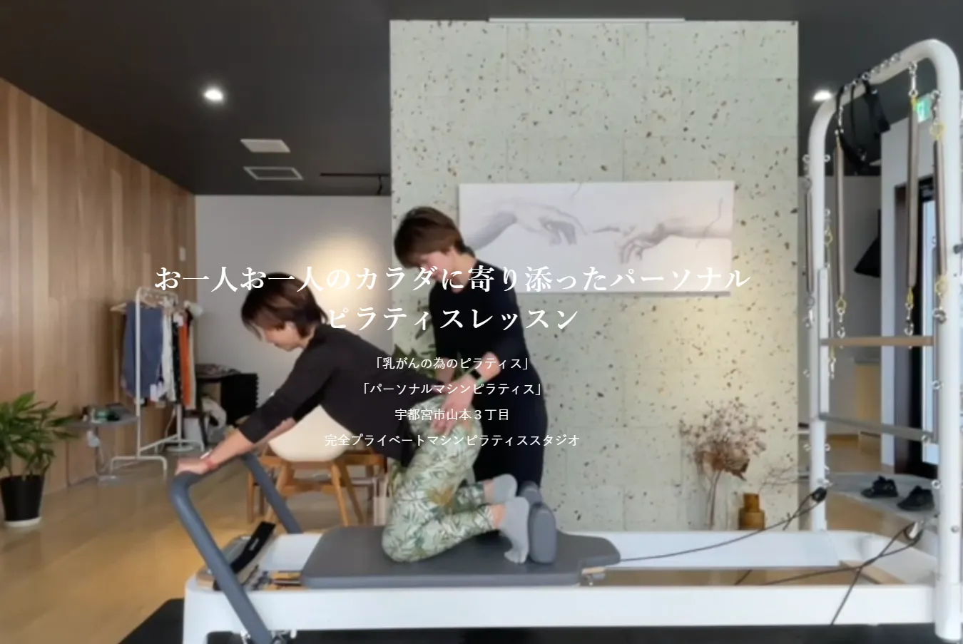 宇都宮市山本3丁目にある完全プライベートのマシンピラティススタジオです。「1つ1つ、1歩1歩。心と身体を1つに。1人1人に寄り添う」という想いを込めた「1.pilates space」では、パーソナルピラティスと栃木県では唯一の乳がんケアピラティスを提供しています。リフォーマー・タワー・チェア・ラダーバレルなど豊富なアパレイタスを取り揃え、完全プライベート空間で人目を気にせず集中してエクササイズができます。Balanced body pilates フル認定インストラクターが、一人ひとりの「今とこれから」に合わせたレッスンを行います。