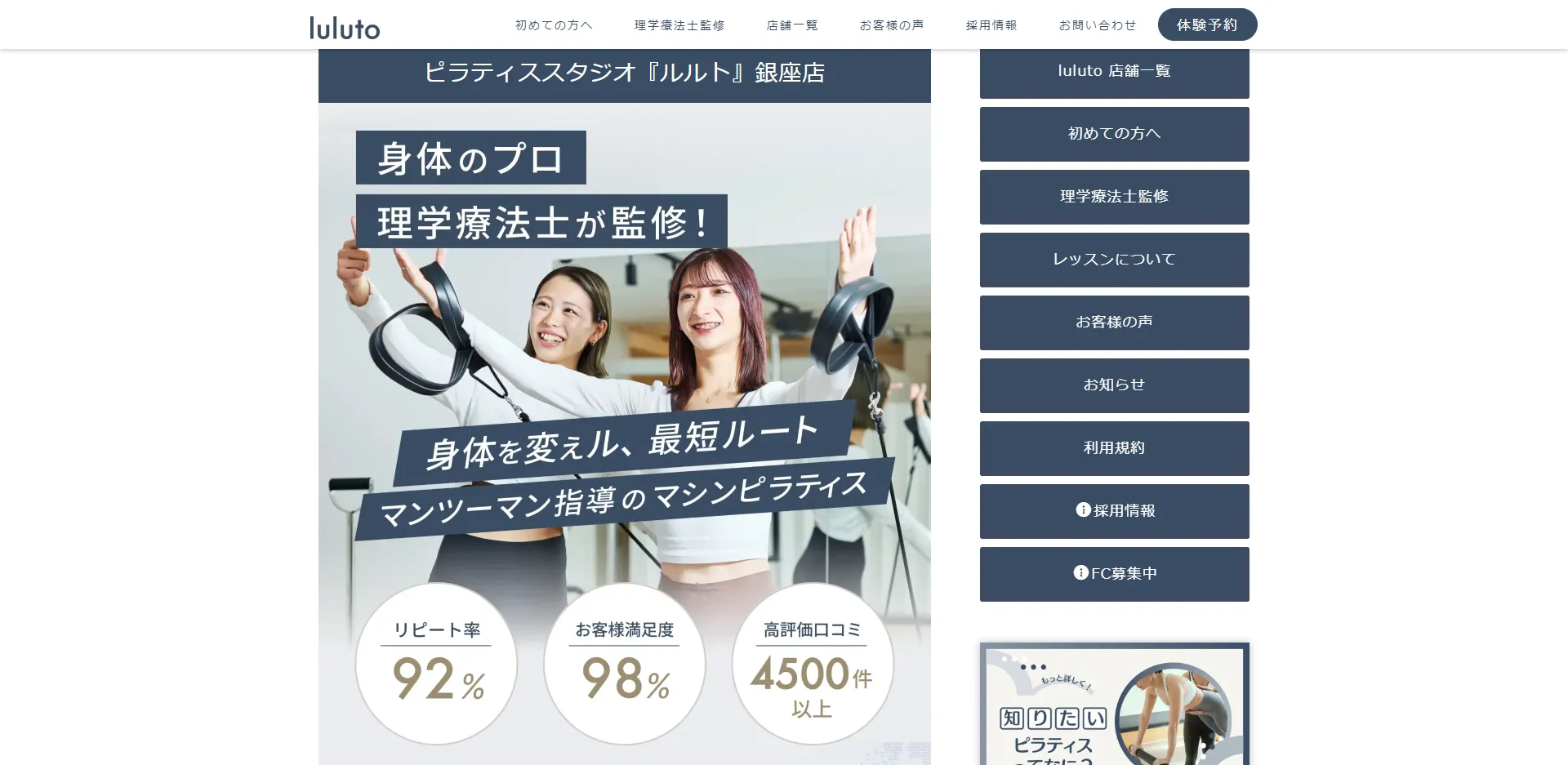 | luluto(ルルト)銀座店 | 公式サイト | 月額29,700円〜 | – | マシンピラティス | パーソナル |