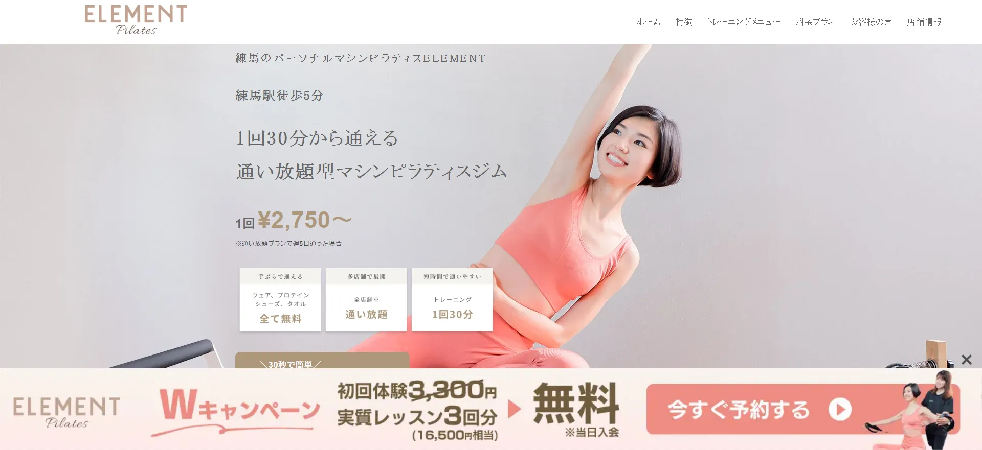 ・練馬駅から徒歩1分の超駅近立地で通いやすい ・マット・マシン・プライベートなど多彩なレッスン形式 ・全国150店舗以上を相互利用できる柔軟なシステム |