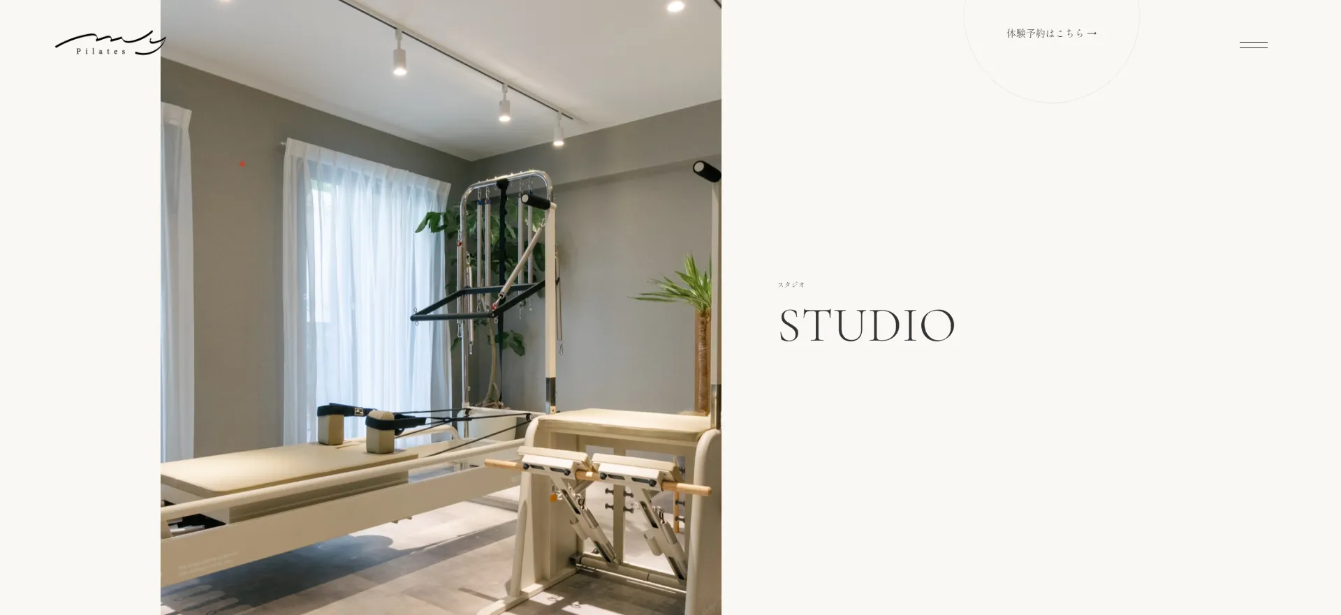 | 料金プラン | マットグループ:月4回 10,450円/月6回 14,520円/フリー 16,940円(税込)|リフォーマーグループ:RG4 15,400円/RG8 25,300円(税込)|プライベート:月4回 37,400円(税込)|体験:9,000円(税別) |