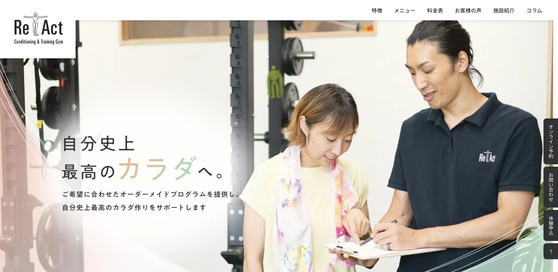 ReAct Conditioning & Training Gym 公式サイト 個別料金設定 カウンセリングあり ピラティス含むトレーニング パーソナル ・マンツーマン指導で目的に合わせたトレーニングが可能