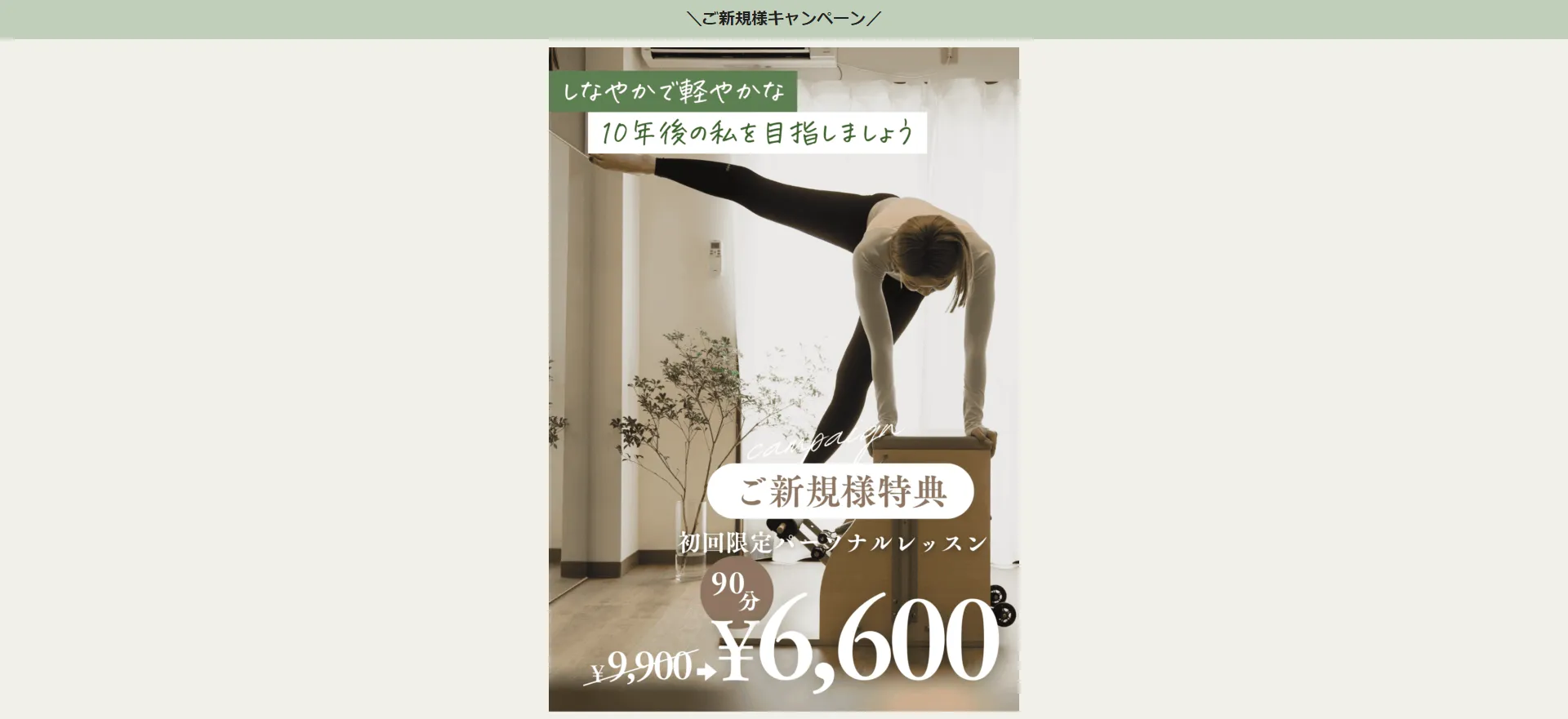 - 初回体験キャンペーン実施中で、まず気軽にピラティスを体験してみたい方にぴったり。
